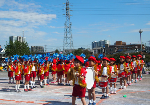 小太鼓、大太鼓、シンバルを使い運動会で披露します